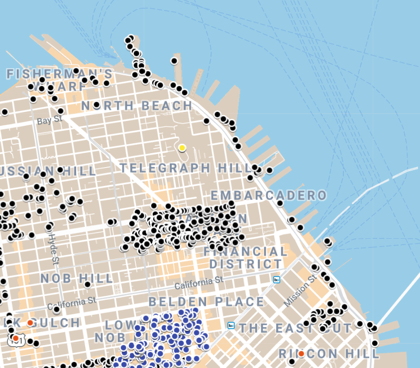 Community Safety Cameras (YELLOW) - There are 71 cameras around San Francisco dating back to a 2006 ordinance passed by the Board of Supervisors. These cameras are purportedly positioned in public areas “in locations experiencing substantial crime.” Public housing projects were especially targeted. For more information, read the 2008 audit [PDF] and Hoodline’s investigative report into the “broken” system.