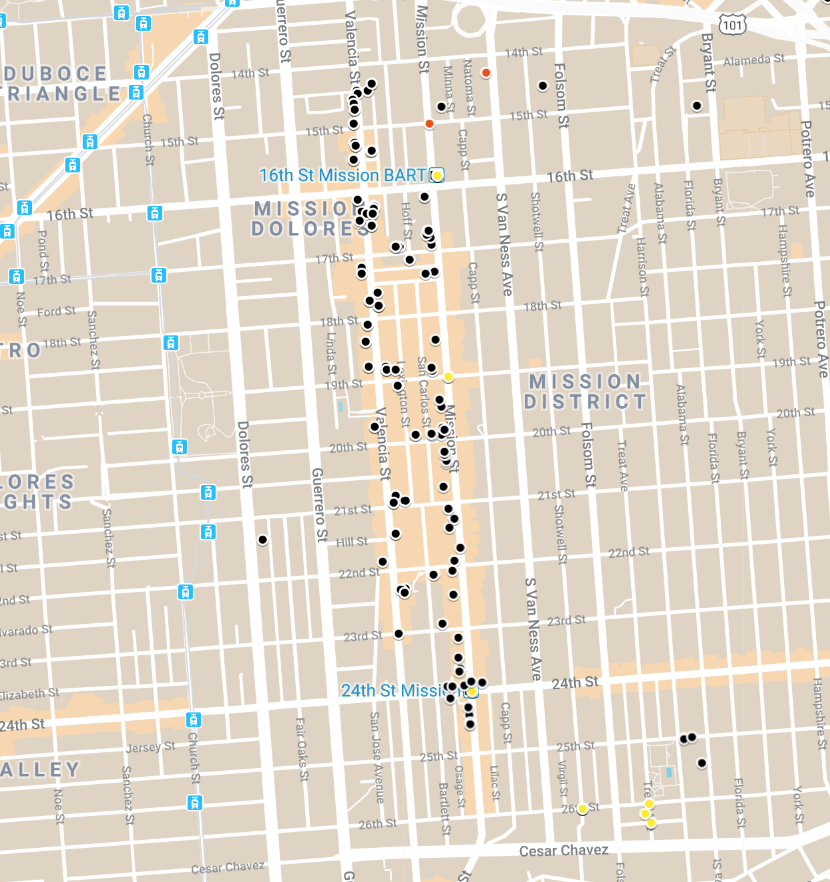 Originally the home of the Ohlone people and later the Chicano/Latinx community, the gentrification of the Mission District has resulted in it being consistently ranked as one of the United States’ hipster neighborhoods. But as craft chocolate and indie fashion boutiques have moved into the neighborhood, so have surveillance cameras, particularly along Mission and Valencia streets. There are also several community safety cameras through the area, including four near Cesar Chavez Blvd.